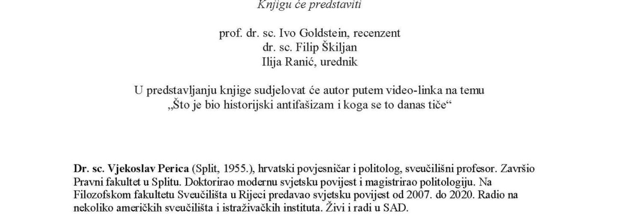 Predstavljanje knjige Vjekoslava Perice Antifašizam. Povijest, mit i aktualnost jednoga svjetskog pokreta 1924.-2024. u organizaciji Plejade d.o.o. i Saveza antifašističkih boraca i antifašista RH održat će se u ponedjeljak 10. studenog 2025. u 18 sati u dvorani SABA RH, Pavla Hatza 16 u Zagrebu.