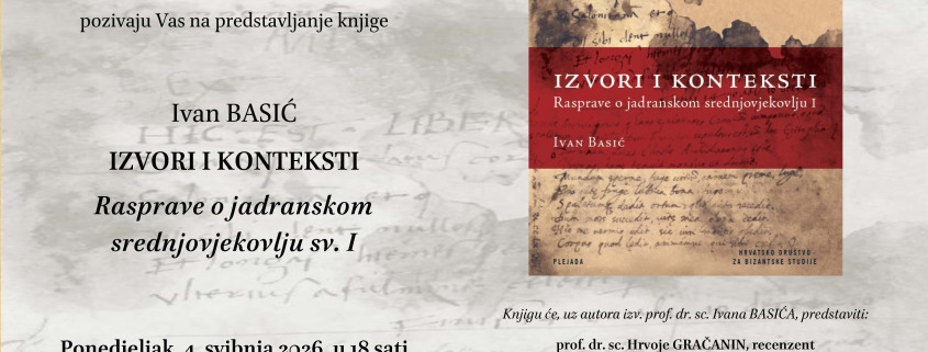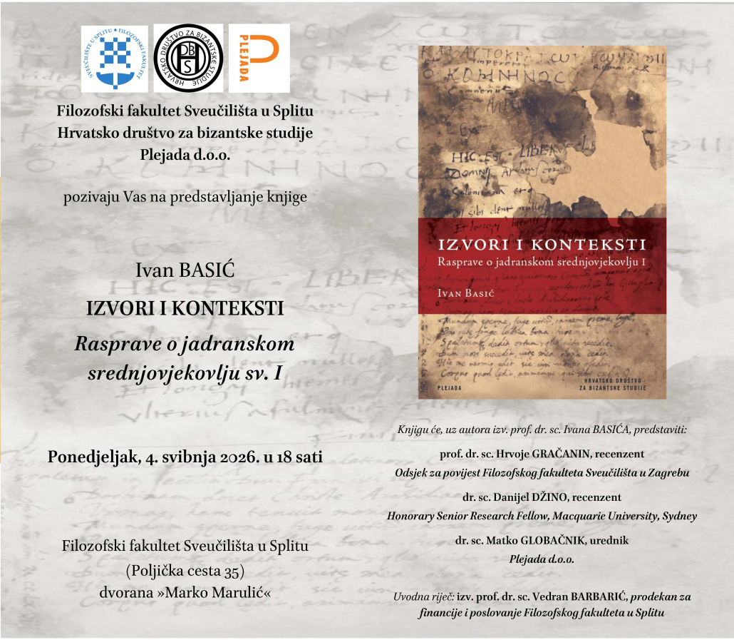 Zadovoljstvo nam je pozvati Vas na predstavljanje knjige Izvori i konteksti. Rasprave o jadranskom srednjovjekovlju. Svezak I, koje će se održati u ponedjeljak, 4. svibnja 2026. u 18 sati u dvorani “Marko Marulić” Filozofskog fakulteta u Splitu (Poljička cesta 35) u sklopu manifestacije Friendship in May Filozofskog fakulteta u Splitu. Knjigu će, uz autora izv. prof. dr. sc. Ivana Basića (Odsjek za povijest Filozofskog fakulteta Sveučilišta u Splitu), predstaviti recenzenti prof. dr. sc. Hrvoje Gračanin (Odsjek za povijest Filozofskog fakulteta Sveučilišta u Zagrebu), dr. sc. Danijel Džino (Honorary Senior Research Fellow, Macquarie University, Sydney) i urednik, dr. sc. Matko Globačnik (Plejada d.o.o.).
